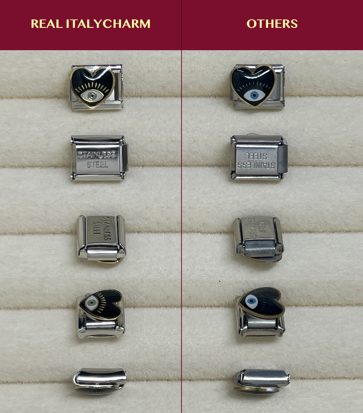 Unlike many imitation products on the market, genuine charm products from ITALYCHARM are made of high quality stainless steel, rust-free, shiny and safe for the skin. Each charm is designed with exquisite detail, guaranteed to make you satisfied.